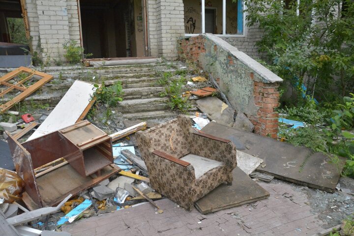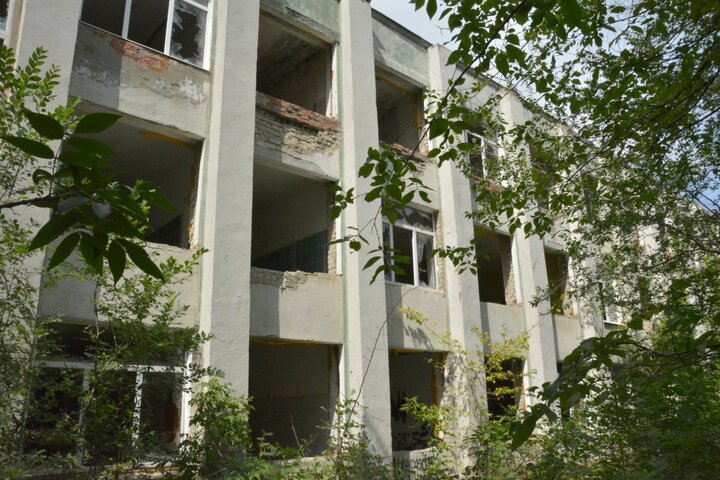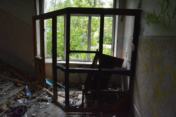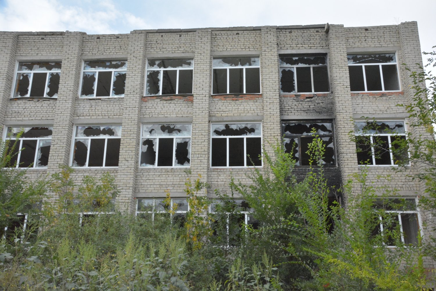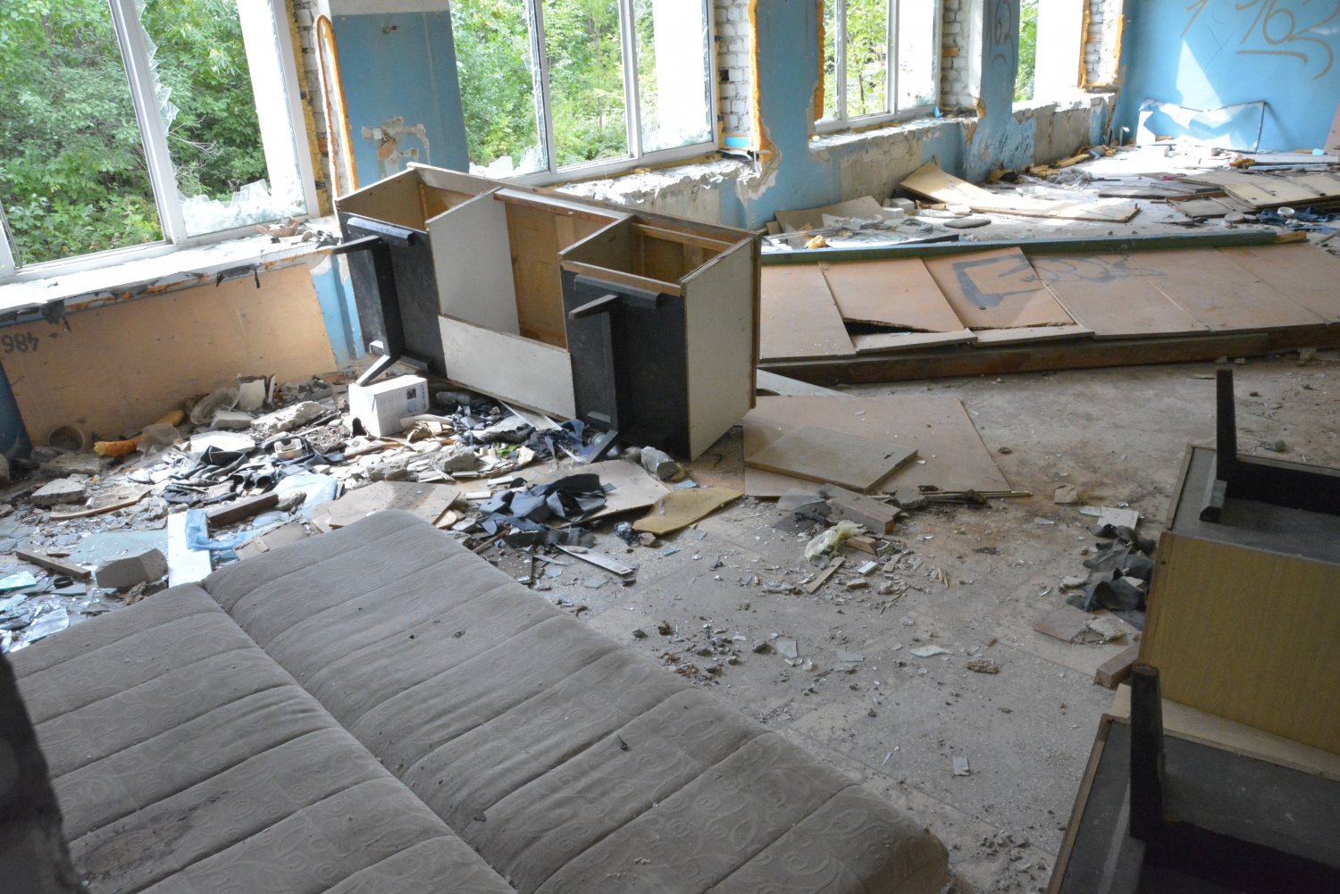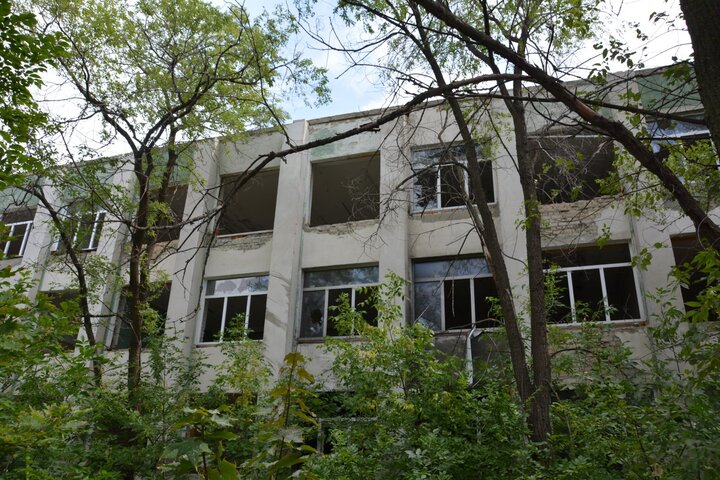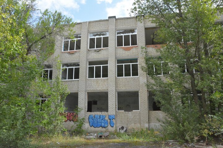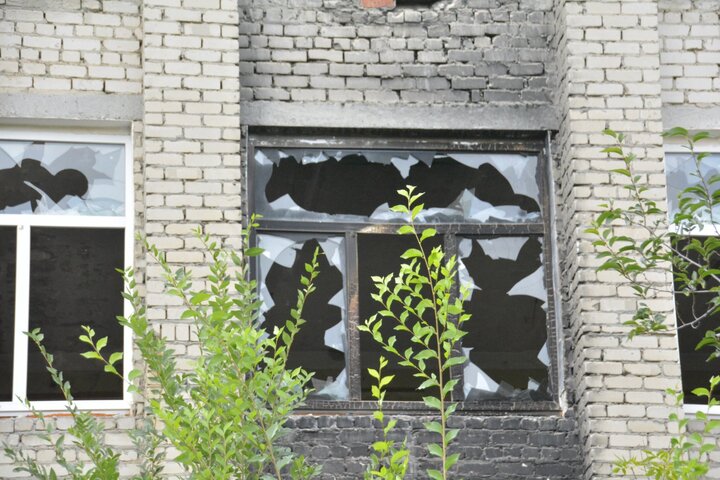 В здании площадью 6267,7 кв. м не осталось ни одного целого стекла. Все выбиты, некоторые выломаны вместе в пластиковыми рамами. Осколками усыпано всё внутри и территория вокруг здания. Внутри осталась какая-то мебель, стены исписаны (в том числе нецензурной лексикой), местами — проломлены. Внутри до сих пор стоит запах недавних пожаров, откуда-то с верхних этажей сочится вода. Окружающая территория завалена бытовым и строительным мусором.