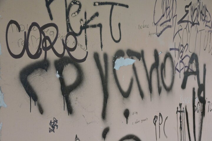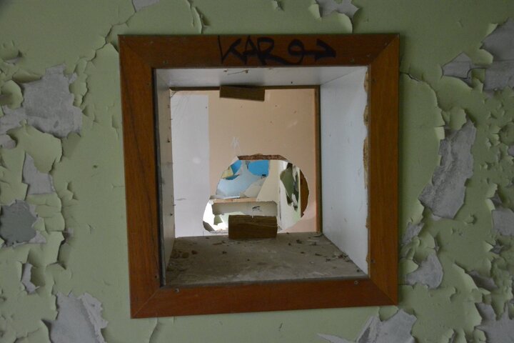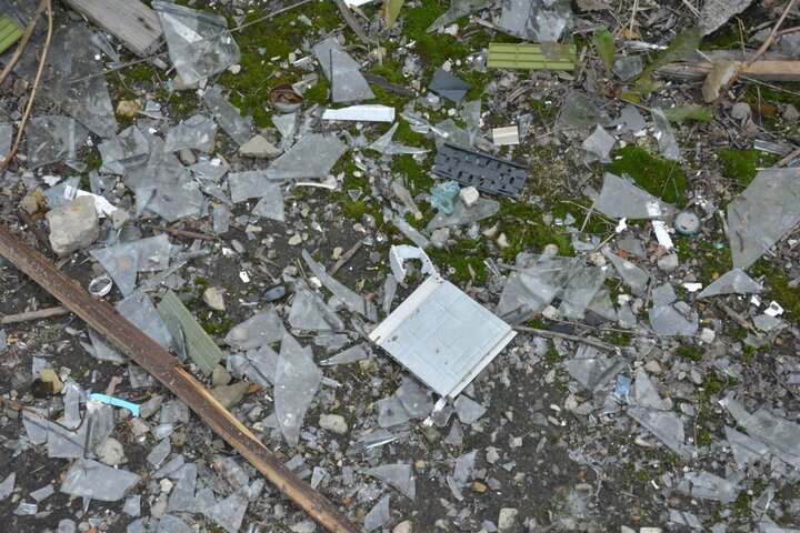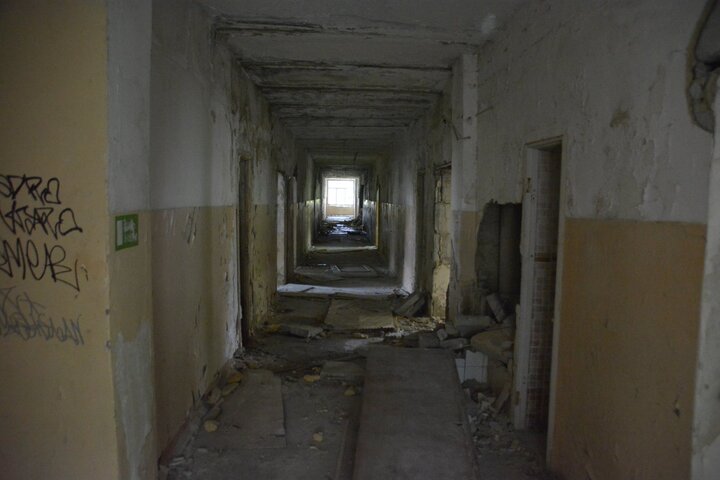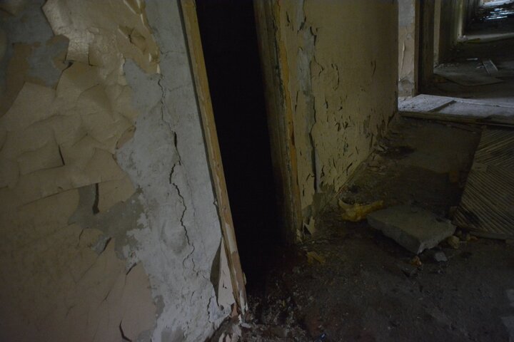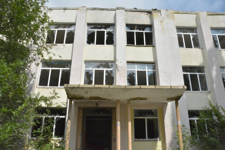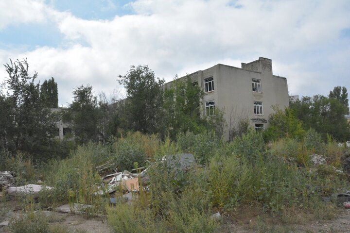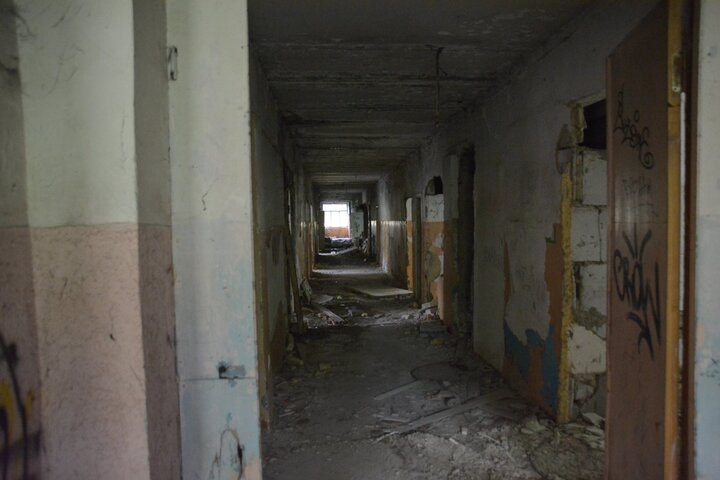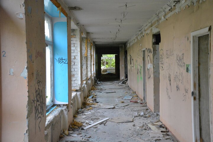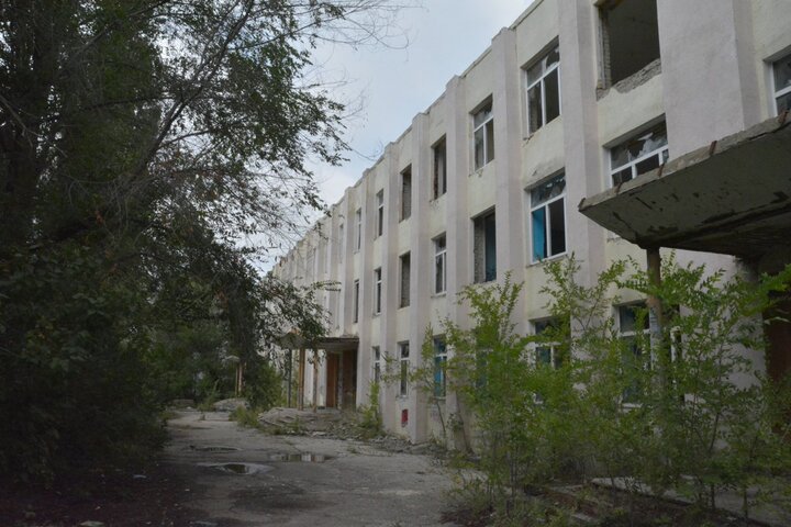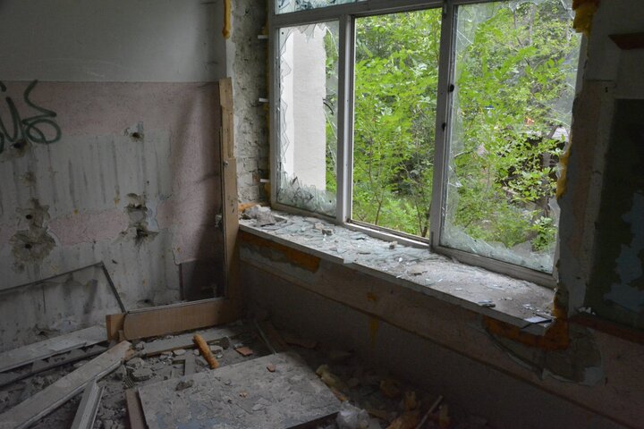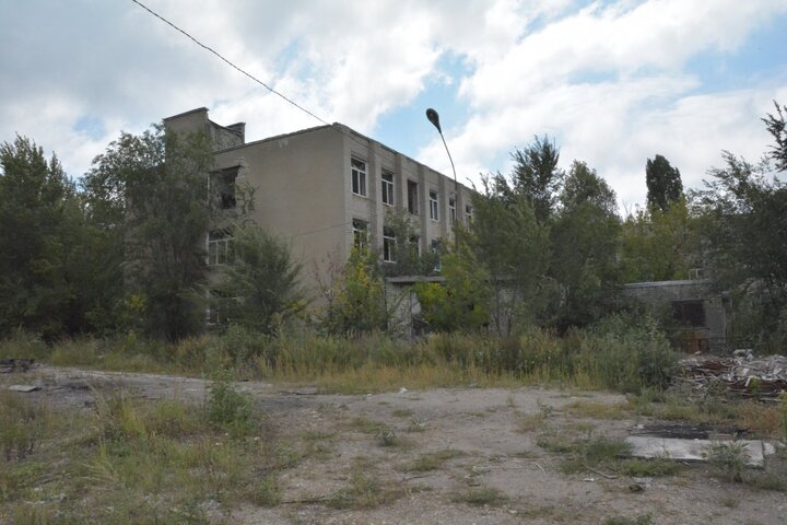 В здании площадью 6267,7 кв. м не осталось ни одного целого стекла. Все выбиты, некоторые выломаны вместе в пластиковыми рамами. Осколками усыпано всё внутри и территория вокруг здания. Внутри осталась какая-то мебель, стены исписаны (в том числе нецензурной лексикой), местами — проломлены. Внутри до сих пор стоит запах недавних пожаров, откуда-то с верхних этажей сочится вода. Окружающая территория завалена бытовым и строительным мусором.