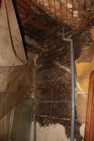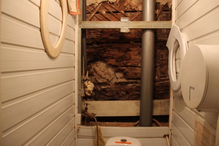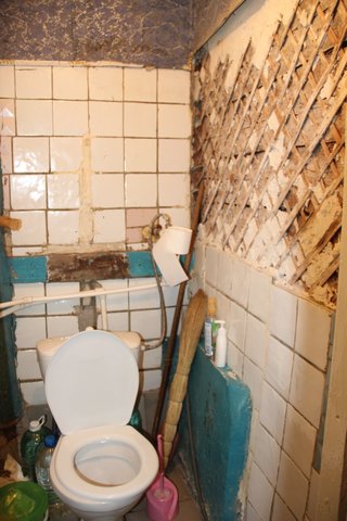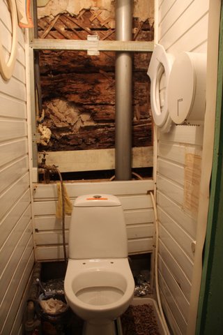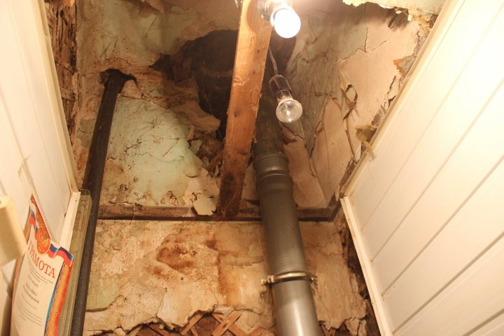 На втором этаже ситуация оказалась не лучше: потолок обваливается, а туалет держится на крышке от шкафа. Причем одна из жильцов-ветеран труда. Пенсионерка показала дыру в потолке: «С него постоянно падает штукатурка, а во время дождя вода течет по стенам. Мебель разбухает».