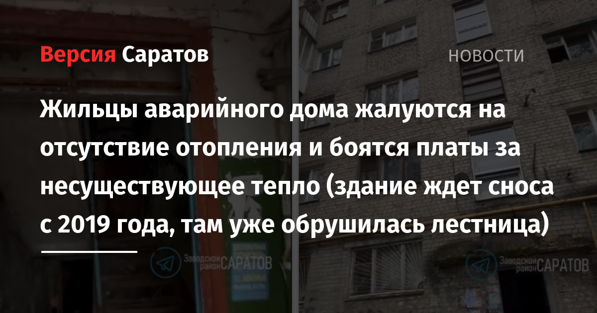 Жильцы аварийного дома в Заводском районе Саратова жалуются на отсутствие отопления и опасаются того, что за несуществующее тепло придется платить. Сообщение о такой проблеме появилось в Telegram-канале «Саратов (Заводской район)». Там также было опубликовано видео, снятое в подъезде этого дома.