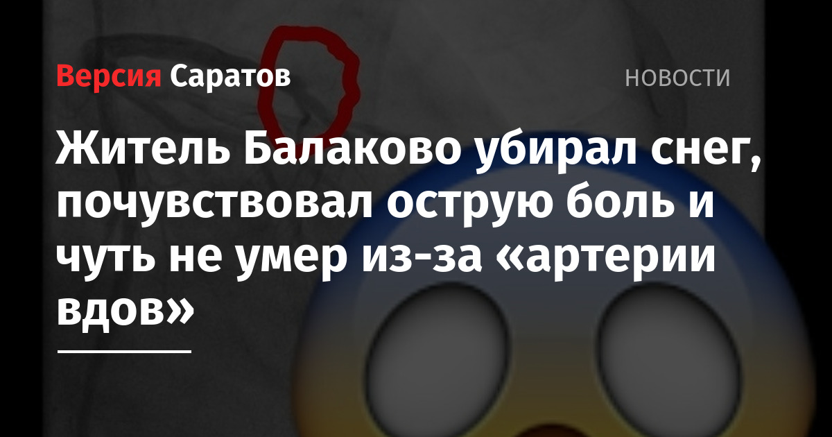 «Пациент, мужчина 59 лет, поступил после того, как почувствовал острую боль в груди во время уборки снега. Бригада „скорой“ диагностировала острый инфаркт миокарда. В ходе обследования была выявлена острая тромботическая окклюзия передней межжелудочковой артерии — сосуда, который неофициально называют „артерией вдов“ из-за высокой летальности при его поражении», — рассказали в балаковской больнице.