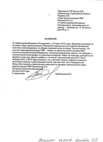 Житель Петровска Вениамин Гребенщиков объявил голодовку с требованием отставки главы администрации Петровского района Светланы Батяйкиной.