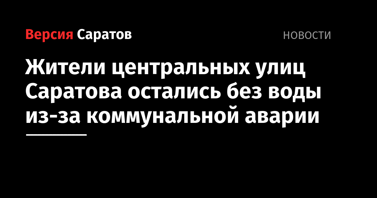 Жители нескольких центральных улиц Саратова остались без холодной воды. Об этом сообщается на сайте «Концессии водоснабжения — Саратов». Воды не будет в квадрате улиц Первомайская — Волжская — Комсомольская — Октябрьская. Предположительно авария на трубопроводе, приведшая к отключению, будет ликвидирована до полуночи.