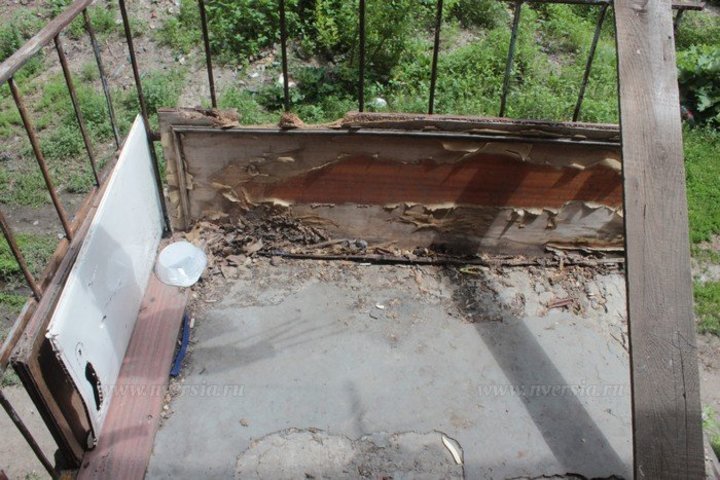 На верхнем этаже дома в нескольких местах рушится потолок. По словам жильцов, были случаи, когда он частично рушился рядом с людьми. "Здесь живут семьи с маленькими детьми. Потолок рушится с каждым днем все сильнее. Попадет на голову кому-нибудь и кто за это отвечать будет?" — отметила местная жительница Юлия Гребенкина.