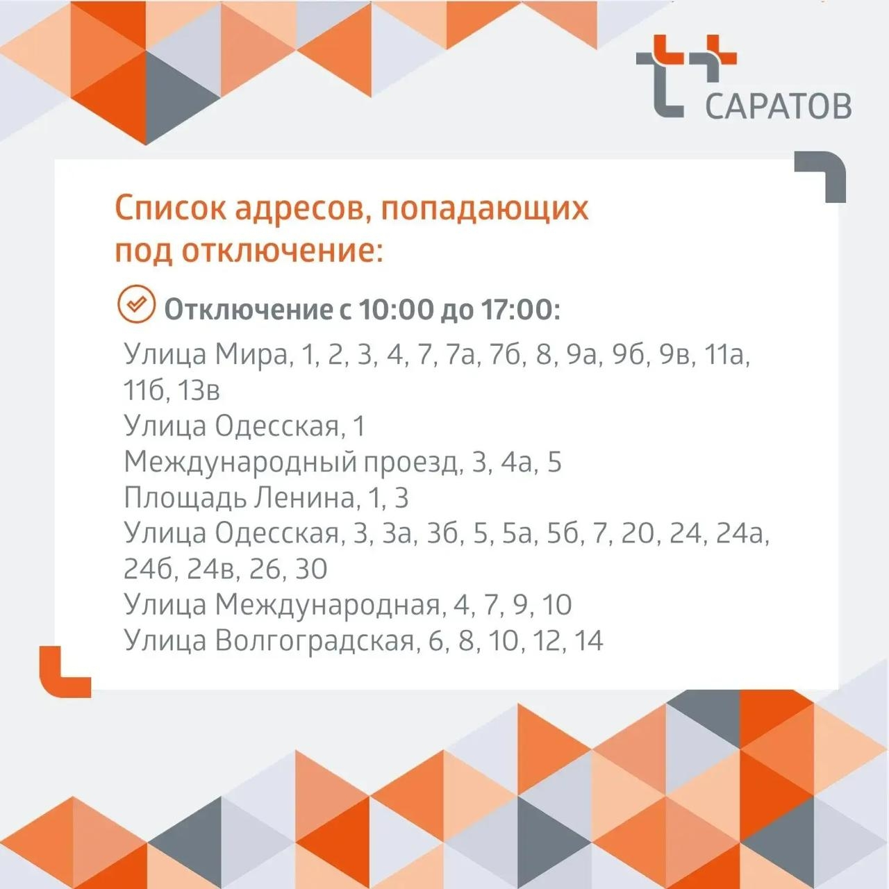 Кроме того, «Саратовводоканал» связи с производственной необходимостью продлил до 20:00 работы по адресу Черниговская, 20. Их начали ещё вчера. Без холодной воды остаются следующие адреса: