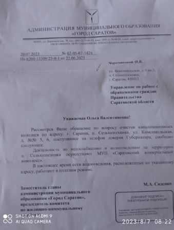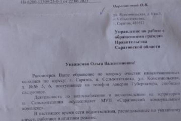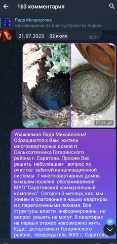 Саратовцы добавили, что страдают от данной ситуации не только жители многоквартирных, но и частных домов, поскольку канализация дотекла уже до них. Горожане назвали свою проблему «криком о помощи» и просят обратить внимание председателя Госдумы Вячеслава Володина, губернатора Романа Бусаргина, главы Саратова Лады Мокроусовой и департамента Гагаринского района.