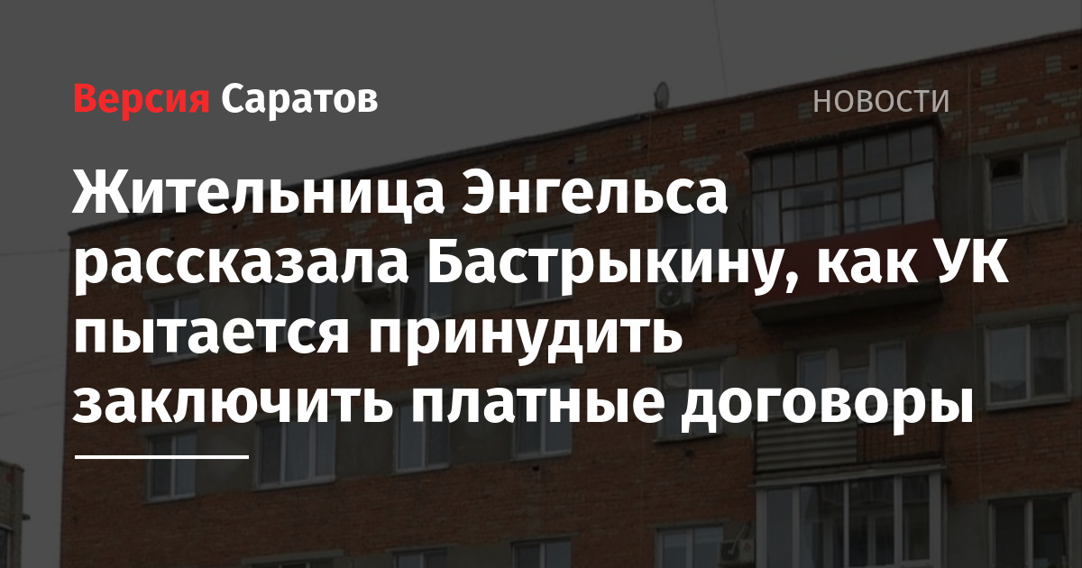 Жительница Энгельса записала видеообращение к главе Следственного комитета РФ Александру Бастрыкину с жалобой на компанию, управляющую домом, в котором она проживает. По словам женщины, УК отключила жильцам газ, чтобы вынудить их платно перезаключить договоры с новой обслуживающей компанией.