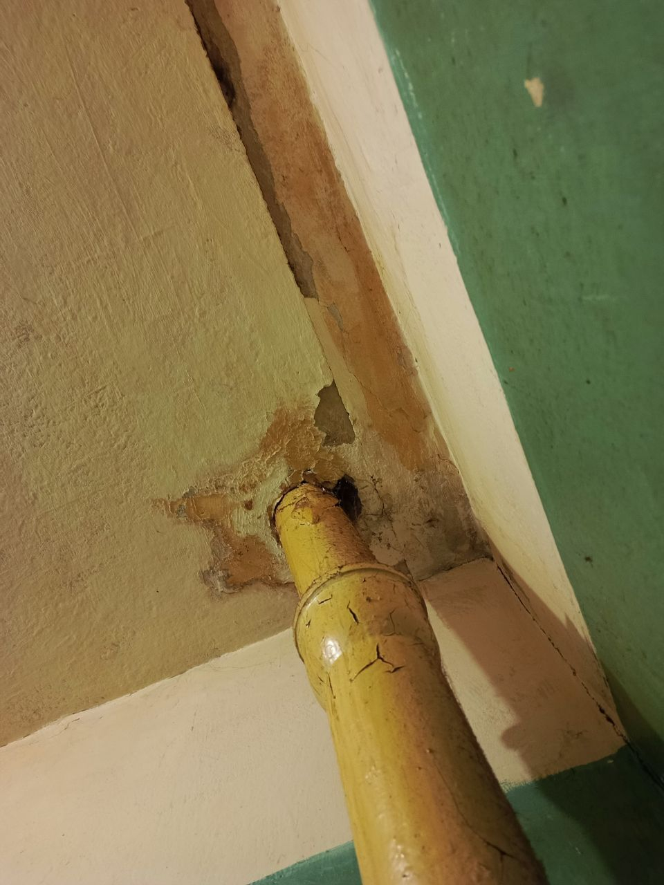 По словам горожанки, «много лет назад» крышу ремонтировали, однако со временем она снова стала течь. «Крыша протекает по стыку. По этому стыку от воды отваливается штукатурка, возле трубы образовалась дыра, в которую также льётся дождь», — поведала местная жительница.