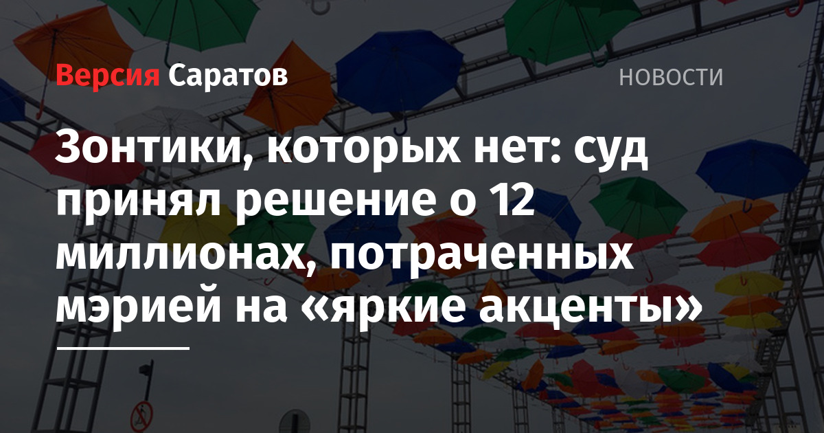 Арбитражный суд Саратовской области принял решение, касающееся спора о 12 миллионах рублей, потраченных на конструкцию с зонтиками в областном центре. Информация об этом содержится в картотеке арбитражных дел.