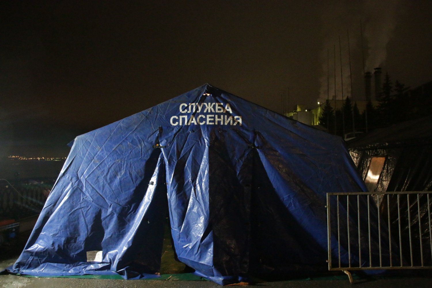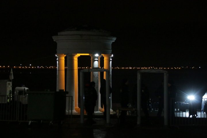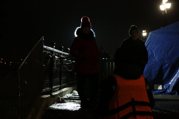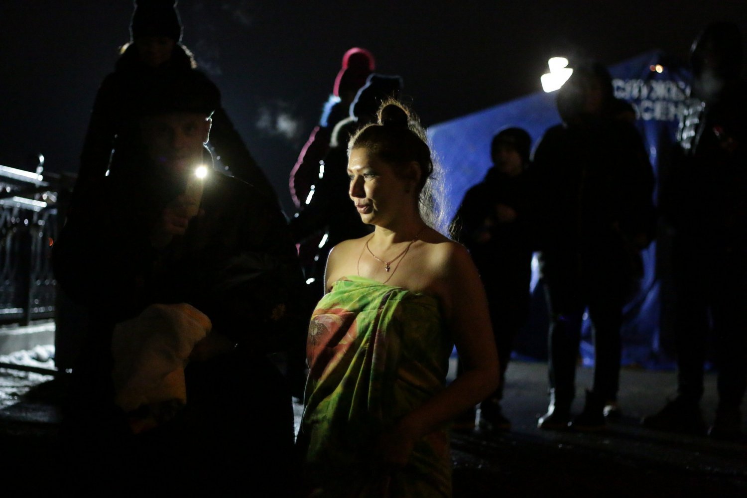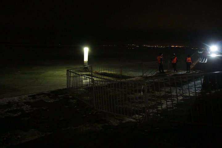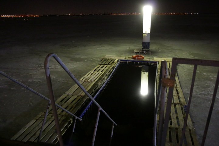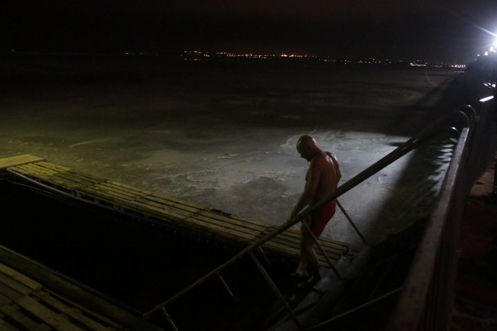 Купальщики могут переодеться в специально обустроенных палатках. Рядом стоят автомобили областной службы спасения. Также на набережной дежурят медики. Пока зрителей больше, чем желающих искупаться. Ожидается, что основная масса желающих окунуться в иордань соберется к 22.00.