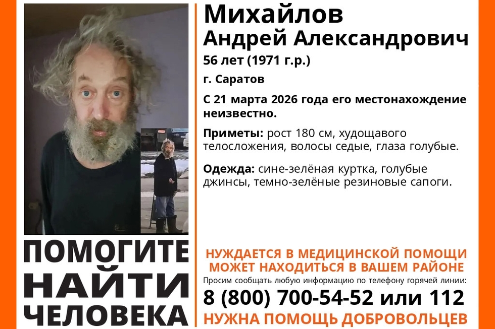 В Саратове волонтёры ведут поиски 56-летнего Андрея Михайлова. Вчера, 22 марта, информацию об этом опубликовали на форуме регионального отделения «ЛизаАлерт».