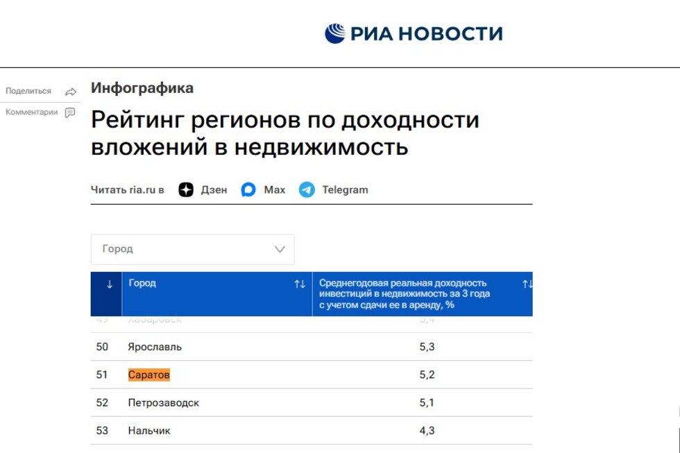 Саратов остался за пределами топ-50 российских городов по доходности вложений в недвижимость новости https://nversia.ru/news/saratov-ostalsya-za-predelami-top-50-rossiyskih-gorodov-po-dohodnosti-vlozheniy-v-nedvizhimost/ Саратов значительно упал в рейтинге российских городов по доходности вложений в недвижимость. Если год назад он располагался на 39-м месте с доходностью 9,3% с учетом сдачи квартиры в аренду, то в новом рейтинге Саратов опустился на 51-е место с показателем 5,2% (без учета аренды — всего 0,5%). Итоги исследования опубликовало сегодня, 13 апреля, РИА Новости. Mon, 13 Apr 2026 08:15:00 +0400 Наша версия