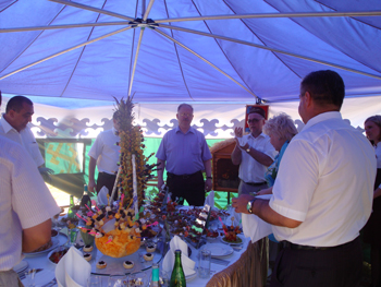 До того как опустили полы «шатра» и выгнали из-под него назойливых журналистов, мы успели увидеть изящно сервированный стол и сделать пару кадров. На нем виднелись целые пирамиды из фруктов и шашлыка, пальма из баурсаков и даже этакий макет столба для местных «столболазов», на вершине которого был ананас... Вообще, сервировщики проявили недюжинную фантазию и оформили стол в стиле тропического острова. Но публичное «пускание слюны» продлилось недолго. Через минуту, после того, как в палатку зашел последний член делегации, последовал властный жест рукой и одно слово в мою сторону - «Достаточно!» Последнее, что донеслось до нас из палатки, были слова Бабичева в ответ на вопрос «А что вы пьете?» - «Как что?! Мы пьем только воду...»
