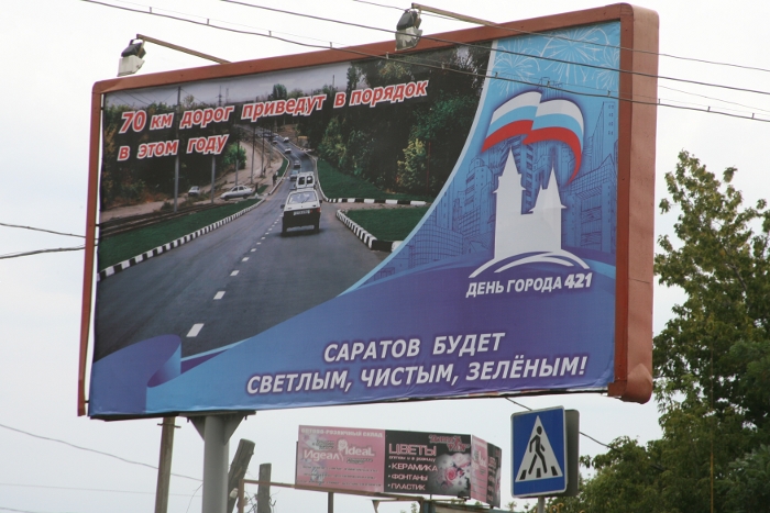 В прошлом году на Саратове опробовали новую тактику распространения единоросского присутствия в черепных коробках потенциальных избирателей. На плакатах, билбордах и всякой праздничной атрибутике ко Дню города поместили логотип, часть которого взяли из официальной символики «ЕР». Флаг, который ранее особым образом развевался над медведем на логотипе «Единой России», теперь был закреплен над изображением саратовской Консерватории. Сделано это было так, что со стороны все праздничные плакаты сильно смахивали на рекламу одной партии.